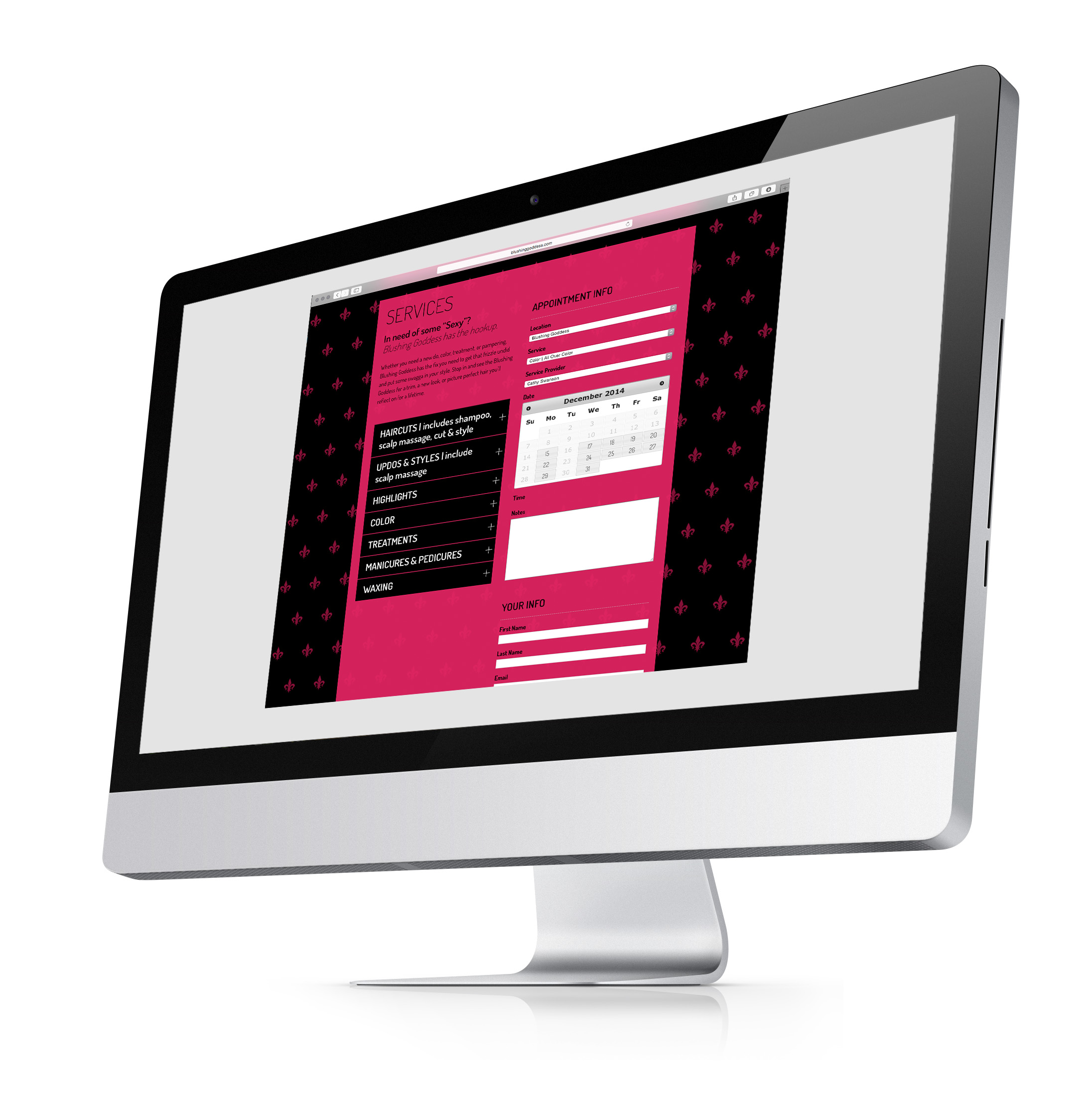 My contributions to the Blushing Goddess print collateral included design and copy for a menu of services, quarterly promotions, and notecards.